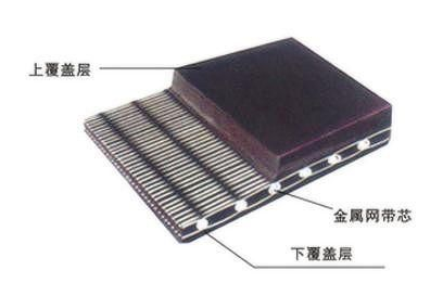 金属网芯输送带带芯是金属螺旋网整体带芯,有耐烧灼、耐高温、耐穿刺、抗撕裂、阻燃,拉伸强度高、伸长率小、成槽性好、硫化接头强力高(接头效率100%)、接头简单易操作等特点。解决了普通输送带经常发生带芯脱层、起泡、覆盖胶掉块、整体被拉断和伸长、接头断开等无法再继续使用的难题。金属钢网芯输送带的使用寿命可达普通耐高温输送带的3-5倍。